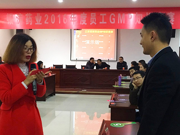 2016年12月18日,在江西星空电竞药业有限公司的员工活动中心举办了一场GMP知识竞赛。出席此次活动的有区工会潘主席,区工会熊主任及星空电竞副总经理、工会主席董木高。